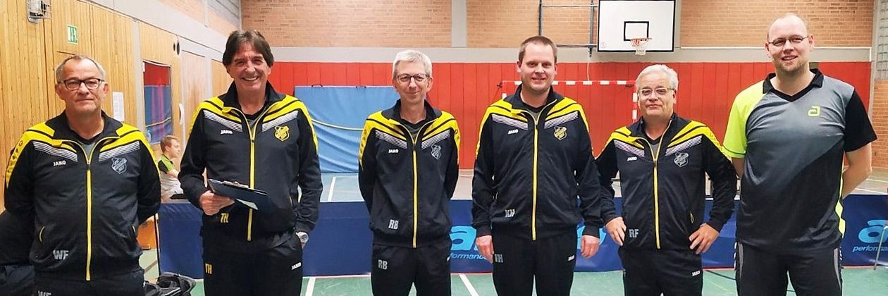 Foto: Im letzten Meisterschaftsspiel von Walter Flaßkamp erreichten die Tischtennis-Herren I des SC Hoetmar ein 8:8-Unentschieden gegen BSV Ostbevern I. Flaßkamp zeigte sich für zwei entscheidende Punkte verantwortlich. Von links: Walter Flaßkamp, Tono Huerkamp, Ralf Beste, Karsten Holtrup, Rainer Freitag und Marc Osthues.