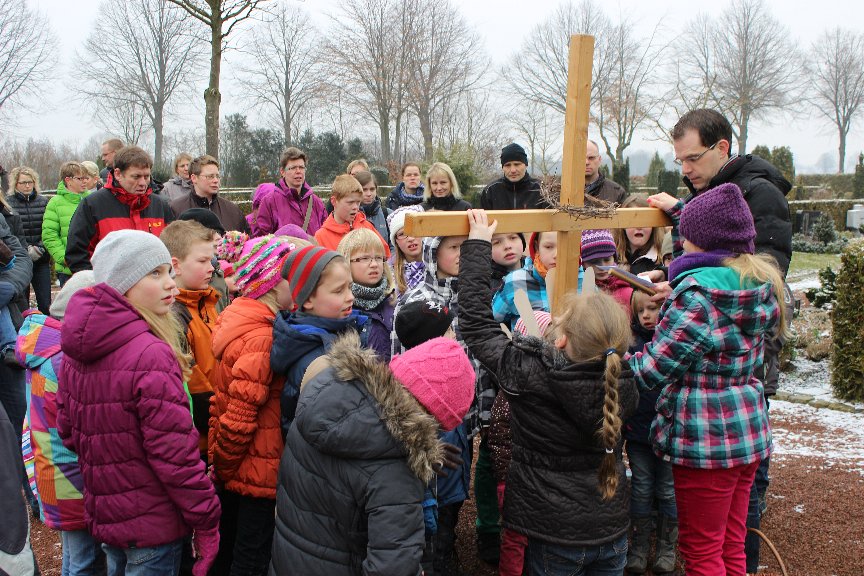 „Heute ist ein stiller und trauriger Tag. Wir erinnern uns an die letzten Stunden im Leben von Jesus“, machte Pastoralreferent Sebastian Bause am Karfreitagmorgen deutlich: „Selbst die Glocken schlagen seit gestern Abend nicht.“ Gemeinsam mit Bause gingen rund 25 Kindern und deren Eltern bei eisigen Temperaturen und Schneefall einen kleinen Kreuzweg durch das Dorf und trugen dabei ein echtes Holzkreuz mit sich.