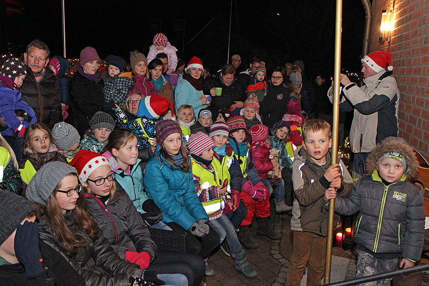Für leuchtende Kinderaugen sorgte natürlich der Besuch von Sankt Nikolaus (Andreas Wiesmann) und Knecht Ruprecht (Willi Kottenstedde). Begleitet von Renate Kortenjann an der Gitarre sangen die Kinder dem Mann mit dem weißen Rauschebart mehrere Lieder und lauschten anschließend gespannt der Geschichte von den vier Kerzen am Adventskranz. Als kleine Überraschung verteilte Nikolaus an alle Kinder eine Tüte, die mit vielen Leckereien gefüllt war.