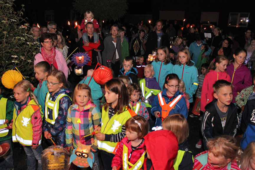 „Kommt wir wollen Laterne laufen“, gab Josef Brand, Vorsitzender des Heimatvereins, das Motto des Abends aus. Mit bunten und selbstgebastelten Laternen zogen viele Kinder mit ihren Eltern und Großeltern kurz nach Einbruch der Dunkelheit durch das Goldorf. Vom Kirchplatz ging es über die Sendenhorster Straße zur Michaelis-Kapelle auf der Gysenbergstraße, wo ein kurzer Zwischenstopp eingelegt und gesungen wurde. Über die Ahlener Straße und Hellstraße führte der Weg wieder zum Kirchplatz. Die Kameraden der Freiwilligen Feuerwehr gab dem Zug mit ihren Fackeln sicheres Geleit. Für die musikalische Begleitung sorgten Barbara Wüller und Michaela Thüsing mit ihren Gitarren sowie eine Abordnung der Jagdhornbläser, die erstmals sogar vom Kirchturm herunter spielten. „Ich habe mich besonders darüber gefreut, dass die Straßenanwohner in ihren Vorgärten bunte Laternen aufgestellt haben“, sagte Brand.