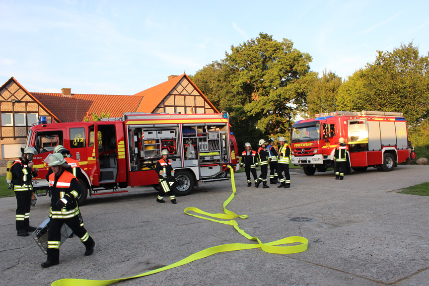 „Im Heizungsraum ist ein Feuerwehr ausgebrochen“, erklärte Einsatzleiter und Zugführer Willi Kottenstedde. Im vom Rauch verhüllten Gebäude seien noch vier vermisste Personen, eine davon sei zusätzlich unter einem Trecker eingeklemmt. Die angerückten Wehrleute verschafften sich zunächst einen Überblick über die Situation, ehe vier Angriffstrupps unter Atemschutz ins Gebäude vordrangen und nach den vermissten Personen suchten. Bei der Suche wurde gleichzeitig der Umgang mit einer Wärmebildkamera geübt. Zusätzlich begannen einige Kameraden mit den Löscharbeiten und die Leitstelle in Warendorf wurde die ganze Zeit über fiktiv über die Einsatzlage informiert.
