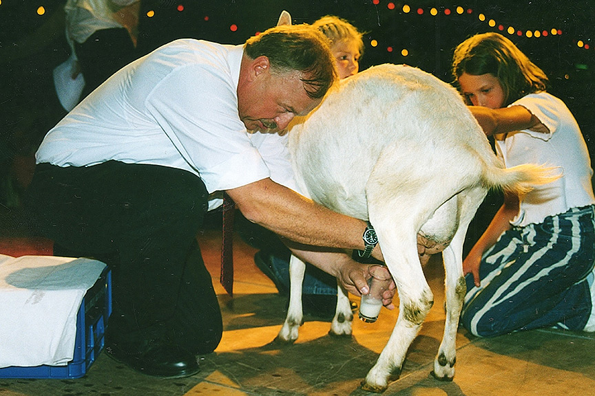 Mächtig ins Schwitzen kam der Vorsitzende auch beim Heimatabend 2002, der ganz im Stile von „Wetten, dass…“ ablief. Anni Thüsing hatte vorgeschlagen, dass Heiner Ruthmann ein Glas Ziegenmilch melken und trinken müsse, wenn er die Saalwette verliere. So kam es natürlich und am Ende des Abends melkte Ruthmann eine eilig aus Füchtorf besorgte Ziege.