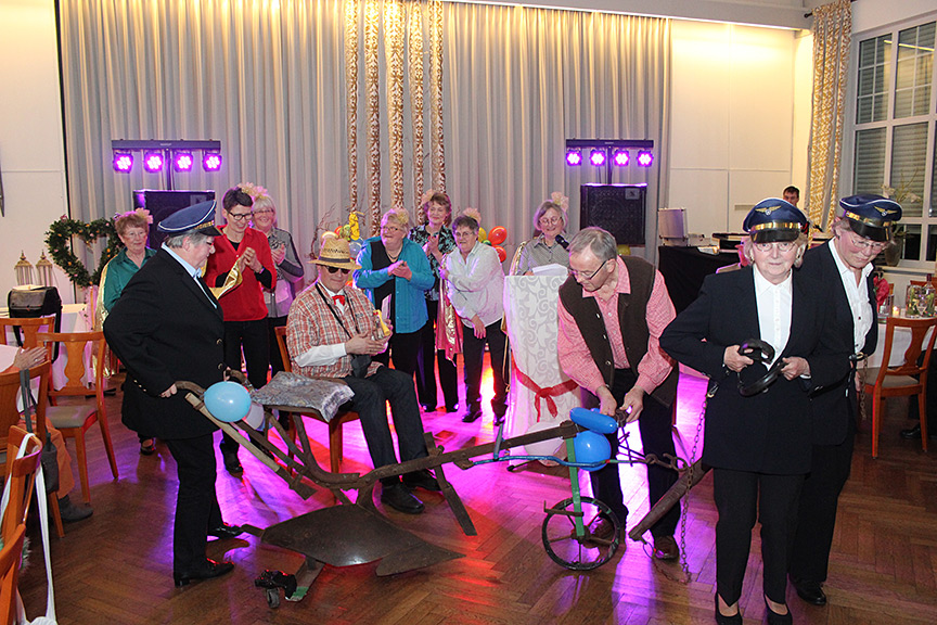 In einem weiteren Programmpunkte waren die Altsängerinnen der Meinung, dass Dirigent Martin Geiselhart Urlaubsreif ist. Nachdem Geiselhart mit Sonnenhut, Sonnenbrille, Reisetaschengeld und Fernglas ausgestattet worden war, ging es für ihn auf eine Pflugreise: Auf einem alten Pflug zogen die Sängerinnen ihn durch den Saal. Durcheinander herrschte dagegen beim Programmpunkt „Familien-Zusammenführung“. Jeder Gast im Saal hatte eine Namenskarte bekommen und musste sich seine weiteren Familienmitglieder suchen. Wem dies am schnellsten gelang, der hatte gewonnen.