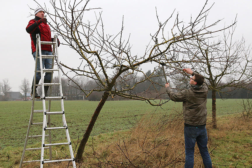 „Im Rahmen des Dorfentwicklungskonzepts kam uns aber die Idee, dass wir Nachbarn die Streuobstwiese eigentlich auch in Eigenregie pflegen könnten“, verrät Norbert Friggemann. Bei Detlef Bäumer fand die Idee der Nachbarn offene Ohren und so wies er sie am Samstagmorgen fachgerecht im Obstbaumschnitt ein. Gemeinsam wurde 16 der 80 Apfelbäume beschnitten.