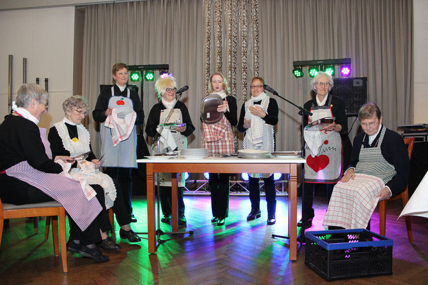 Verantwortlich für das Programm zeichneten sich in diesem Jahr die Sängerinnen des Soprans. Als Schornsteinfeger verkleidet brachten sie ihren Gästen nicht nur Glück, sondern mit ihren Sketchen und musikalischen Darbietungen auch zum Lachen. Schauspielerisches Talent zeigten die Sängerinnen beispielsweise im Sketch „Tabasco“. Als Hausfrauen verkleidet, beobachteten sie einen Empfang des Kirchenvorstandes und nahmen verschiedene Persönlichkeiten Hoetmars mit viel Humor auf die Schippe. Aber auch die übrigen Programmpunkte „Tanz der Mädchen“, „Zwei Frauen unterwegs“ und „Lust auf Schokolade“ kamen bei den Gästen im Saal sehr gut an.