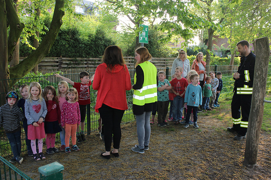 Als eine besondere Herausforderung bewies sich für die Erzieherinnen und Feuerwehrleute gleichermaßen, die Kinder an den Sammelpunkten zu halten. „Die Kinder wollen natürlich gucken, was die Feuerwehrleute machen und am liebsten möglichst nah ans Gebäude rangehen“, so Recker. Ebenso knifflig sah Zugführer Willi Kottenstedde die enge Zufahrt zur Kita über den Rövkamp. Im Prinzip müsse man sich bereits beim Einbiegen in die Straße darüber im Klaren sein, wie man die Feuerwehrautos stellen will: „Für eine Drehleiter ist hier kaum Platz. Man könnte höchstens noch über den Bolzplatz ranfahren.“