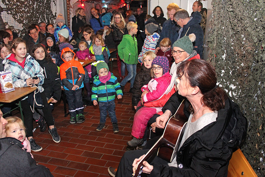 Für alle Kinder war natürlich der Besuch von Nikolaus (Andreas Wiesmann) und Knecht Ruprecht (Willi Kottenstedde) der Höhepunkt des Abends. Als sie den Mann mit dem roten Gewand und dem weißen Rauschebart sahen, stimmten die Kinder „Sei gegrüßt lieber Nikolaus“ an. Musikalisch begleitet wurden sie dabei von Gitarrenspielerin Renate Kortenjann. Im Anschluss hörten sich die Kinder eine Weihnachtsgeschichte an und waren erleichtert als Nikolaus sagte: „Knecht Ruprecht, Du brauchst die Rute heute nicht.“ Stattdessen schenkte Nikolaus allen Kindern eine Tüte mit Süßigkeiten.